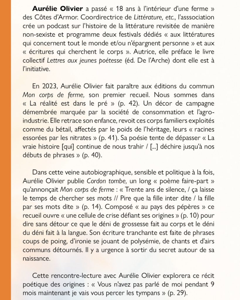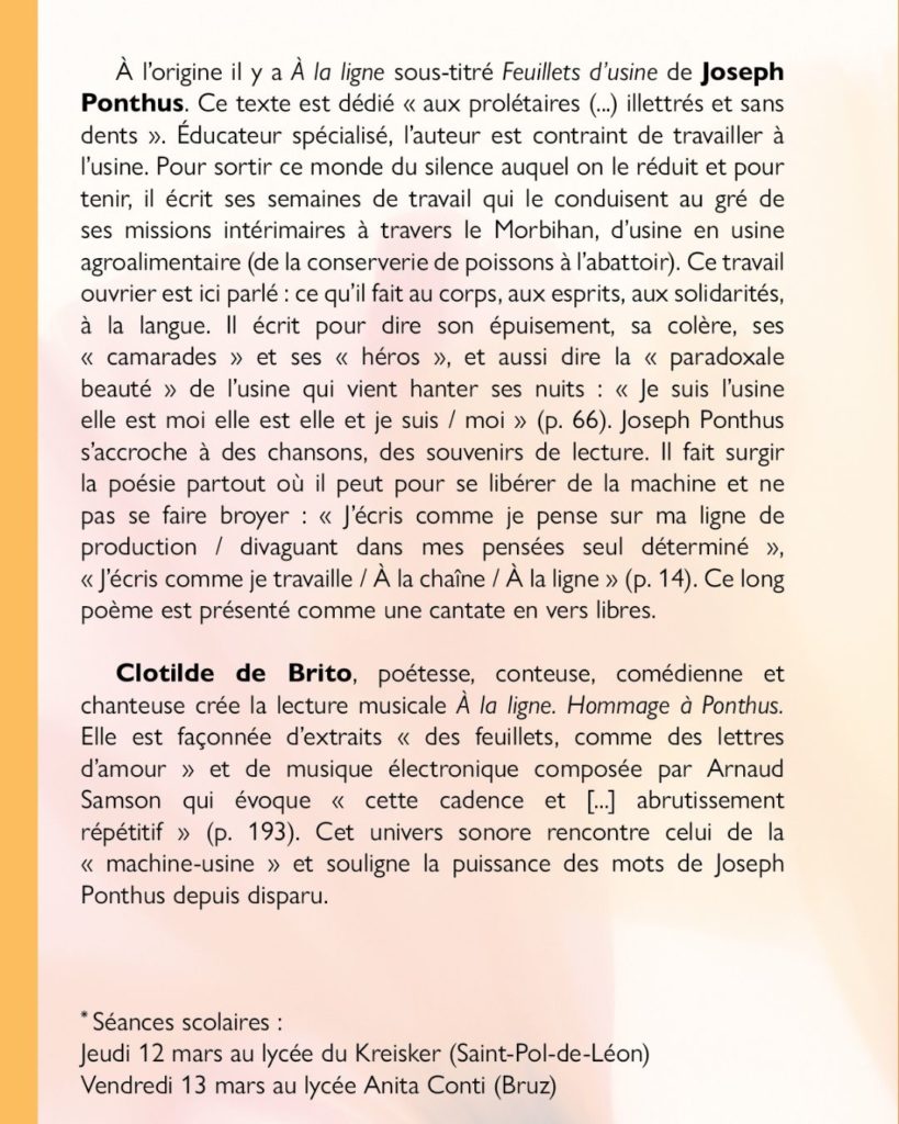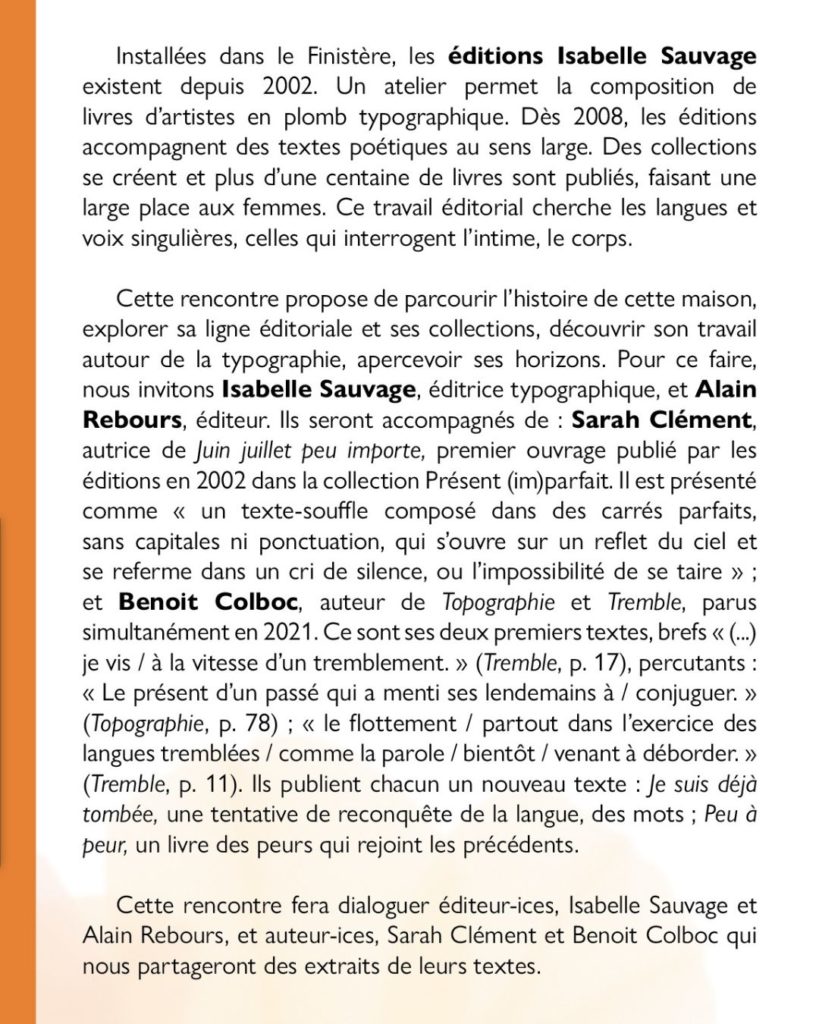 Aurélie Olivier, Clotilde de Brito (hommage à Joseph Ponthus), Christian Prigent et Vanda Benes, Isabelle Sauvage accompagnée d’Alain Rebours, de Sarah Clément et de Benoit Colboc, Fabienne Raphoz, Karim Kattan, Émilie Sciot, Jean-Philippe Rossignol et Lucie Lamy (traducteurs de May Ayim), Lucien Suel, François de Cornière.