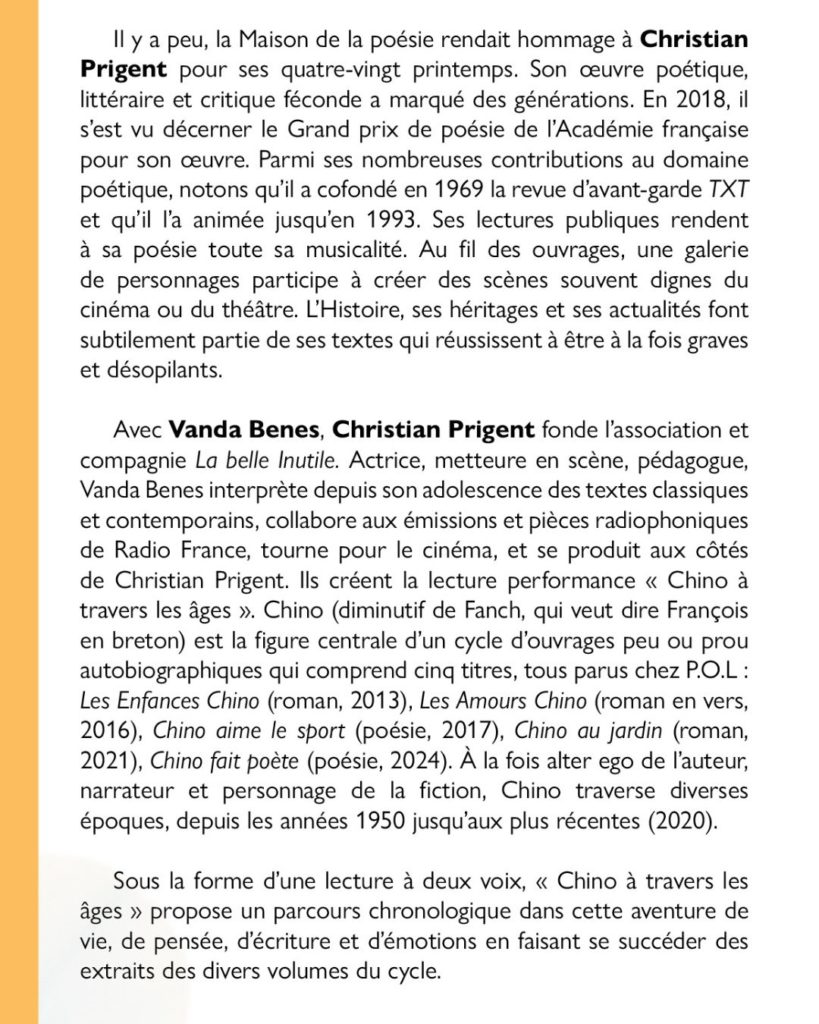 Ce programme est une invitation à la découverte, de rencontre en rencontre, de poésie en poésie. Toutes les curiosités et les sensibilités sont les bienvenues. Il n’est pas nécessaire d’avoir lu ces textes pour nous rejoindre.