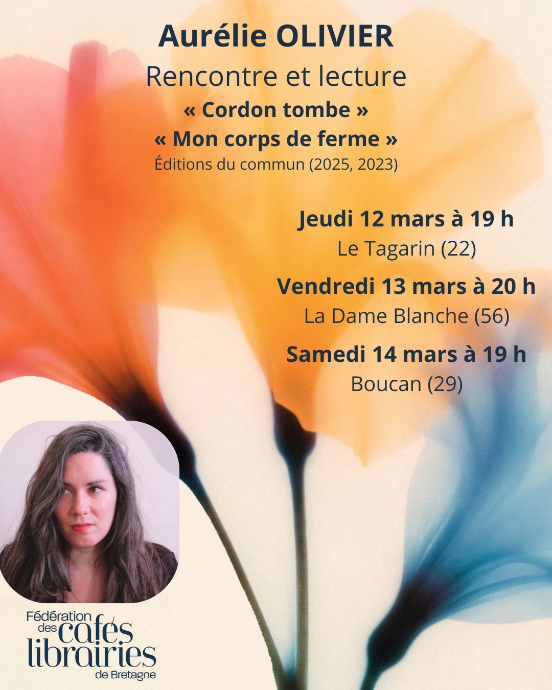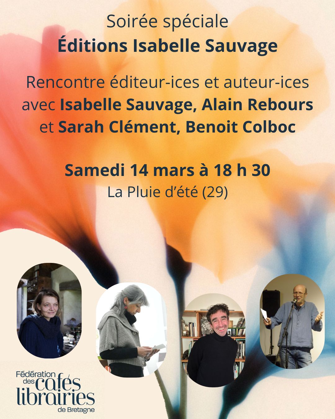 Ces rencontres ont été chaleureusement accueillies par les libraires des cafés-librairies de notre association : Le Bel Aujourd’hui • Le Tagarin • Le Temps qu’il fait • La Canopée • Les Déferlantes • L’Ivresse des Mots • Boucan • L’Embellie • La Veilleuse • Livres in Room • Le Bateau Livre • Les Métamorphoses • La Pluie d’été • La Gède aux Livres • Elizabeth & Jo • La Cabane à Lire • De l’Encre à l’Écran • Clef des Mondes • La Dame Blanche.