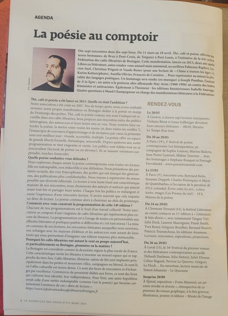 Nous aurons le plaisir de vous retrouver dans nos cafés-librairies du 11 mars au 18 avril pour la 14ᵉ édition de Thé, café et poésie. Le programme des rencontres vous sera partagé au plus tard en février.